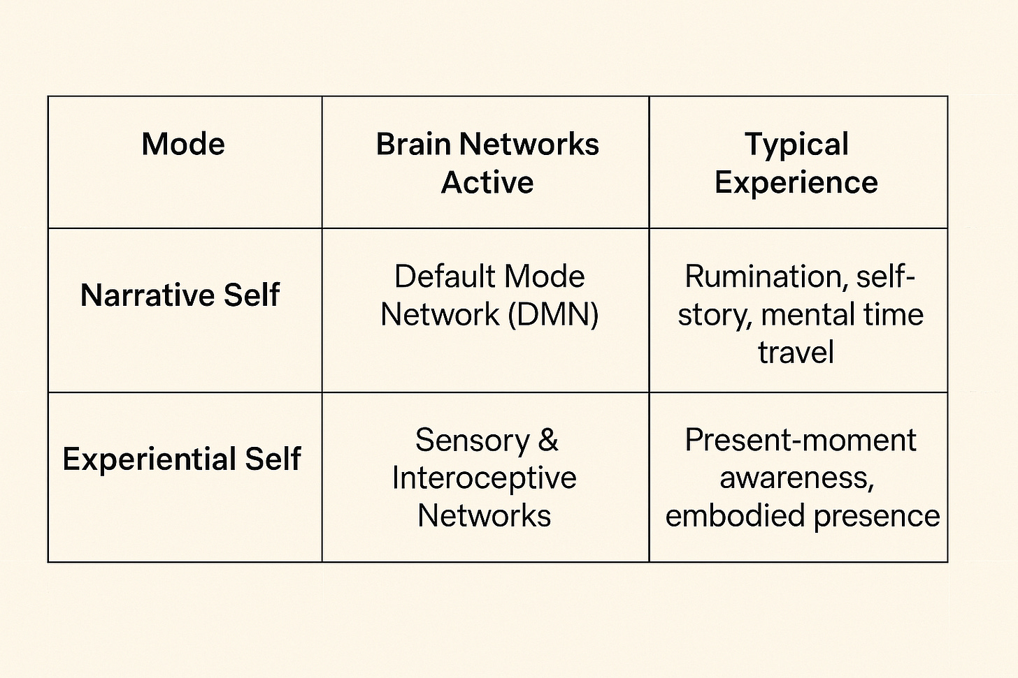 This shift is sometimes described as moving from the narrative self to the experiential self—from thinking about life to directly experiencing it.