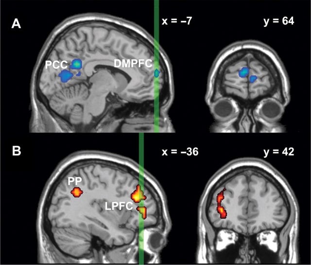 (A) Areas of greater association with the Narrative condition (Narrative > Experiential) are in blue, and (B) areas of greater association with the Experiential condition (Experiential > Narrative focus) are in red.